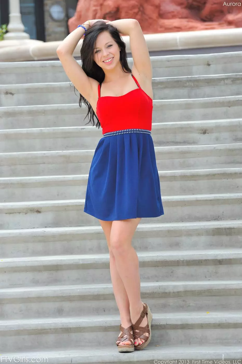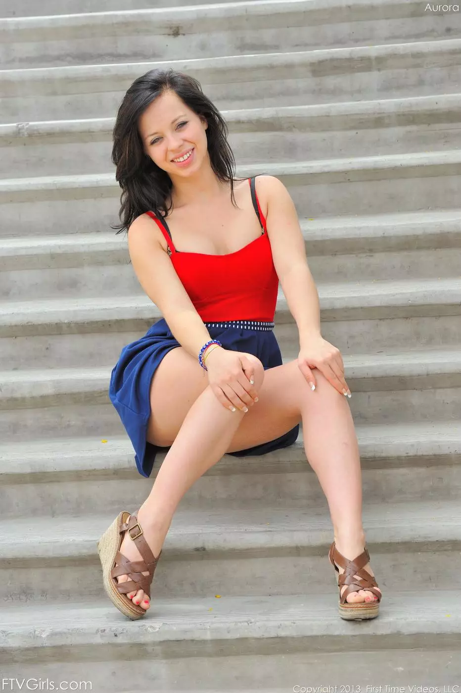 Игривая девочка-подросток Aurora Monroe бесстыже показывает круглую попку и голую киску под юбкой — Aurora Monroe