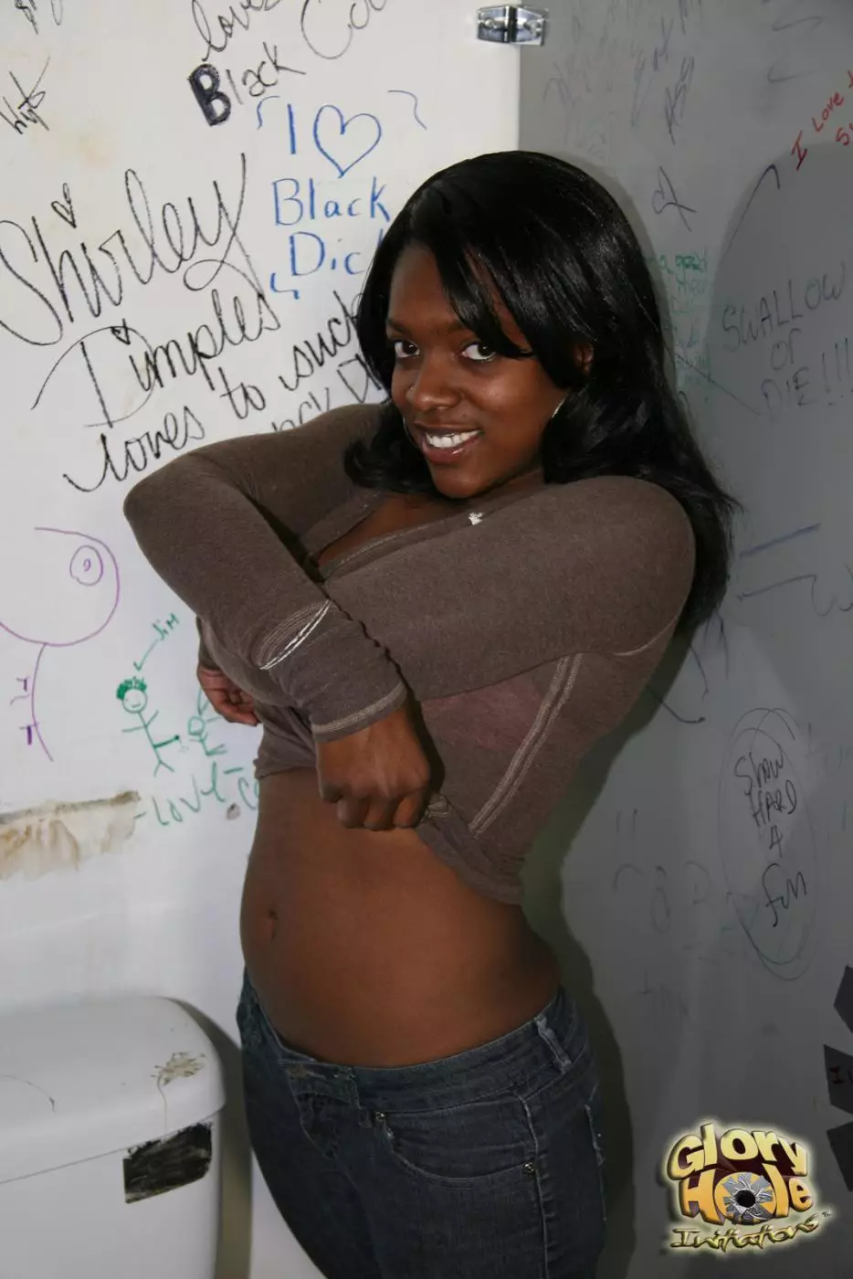 Возбужденная черная шлюшка Jordan Love ласкает белый член, торчащий из дырки в стене — Jordan Love