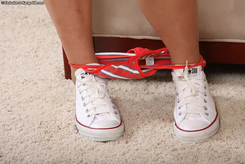 Улыбчивая темноволосая потаскушка Alana Leigh в белом топике и красной юбке показывает свои шары и бритую пизду — Alana Leigh