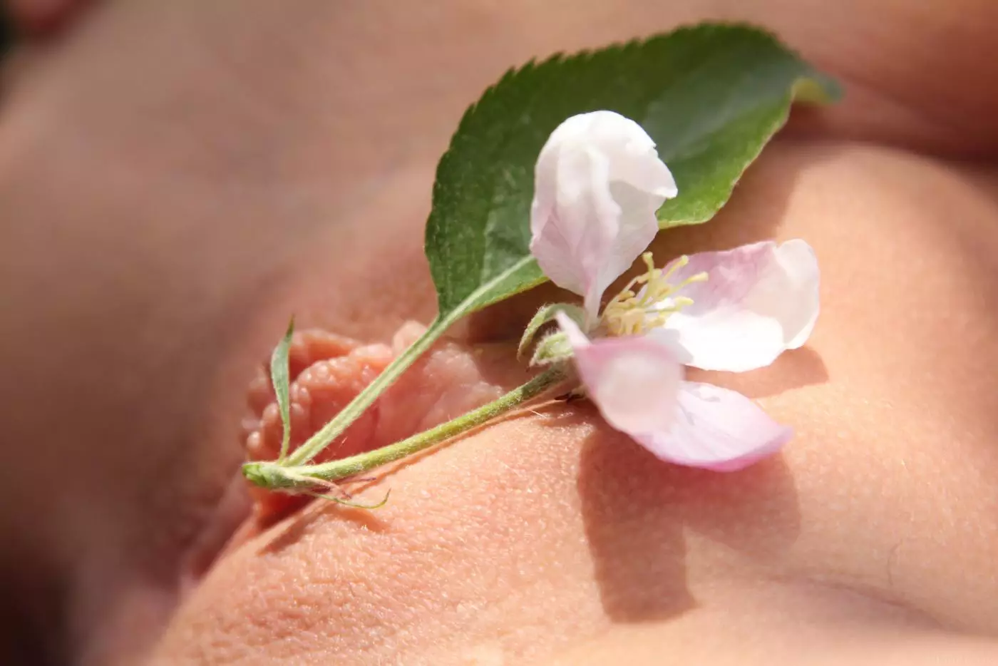Невероятно красивая блондинка-подросток Mango A позирует на природе в плодовом саде — Mango A
