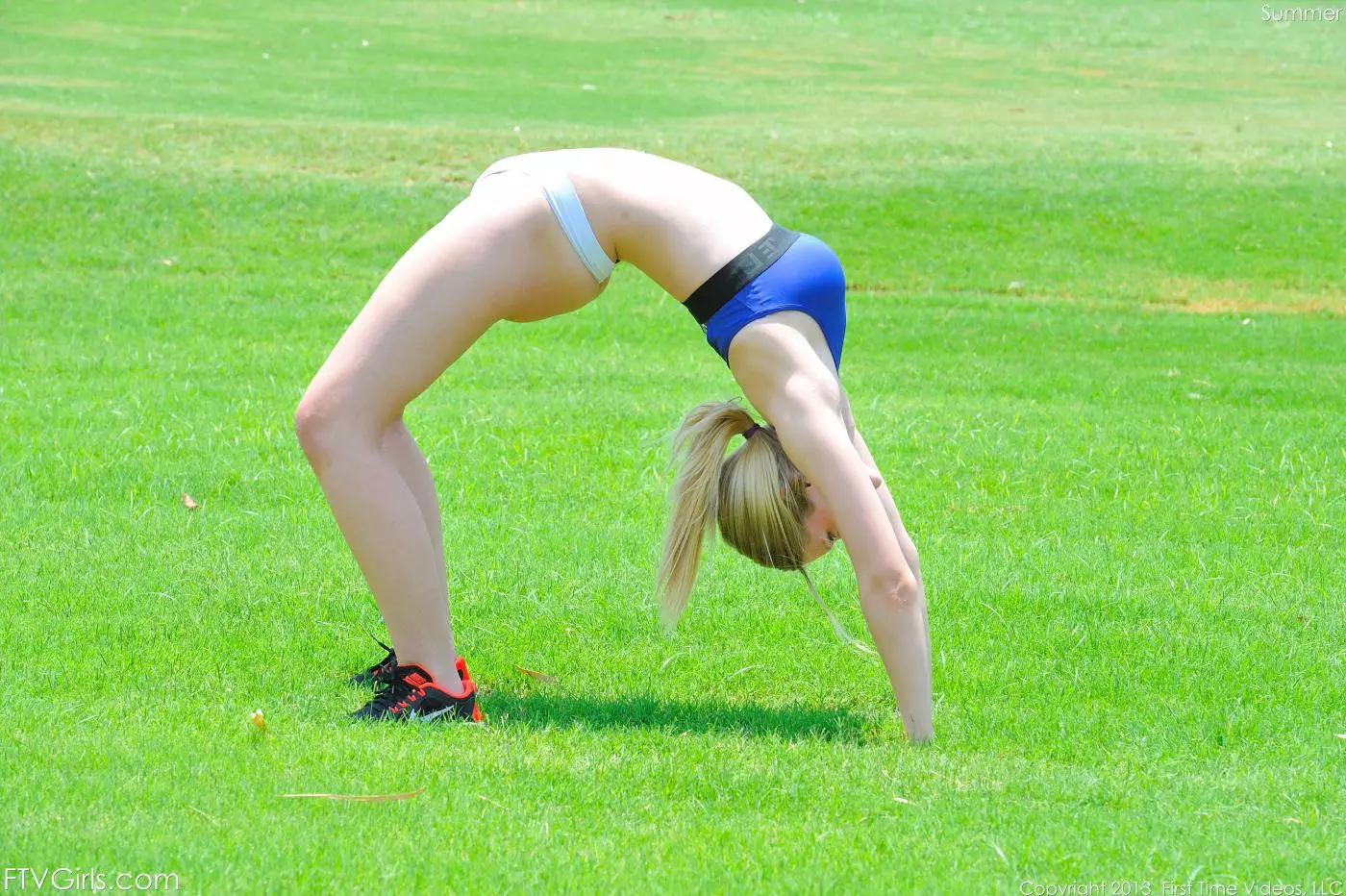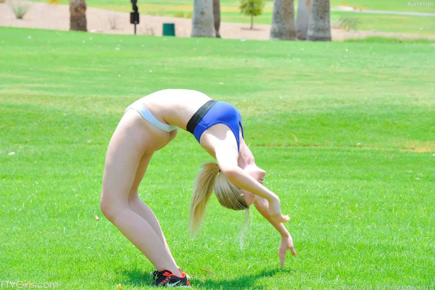 Гибкая светловолосая куколка Summer FTV делает упражнения на улице и раздевается догола — Summer FTV