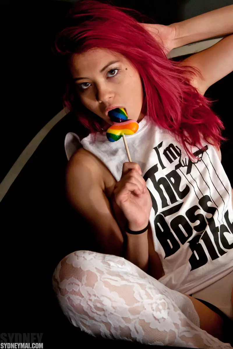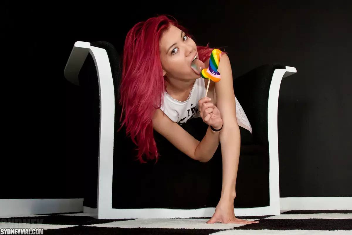 Рыжая азиатка в белых чулках Sydney Mai ест мороженое и мастурбирует — Sydney Mai