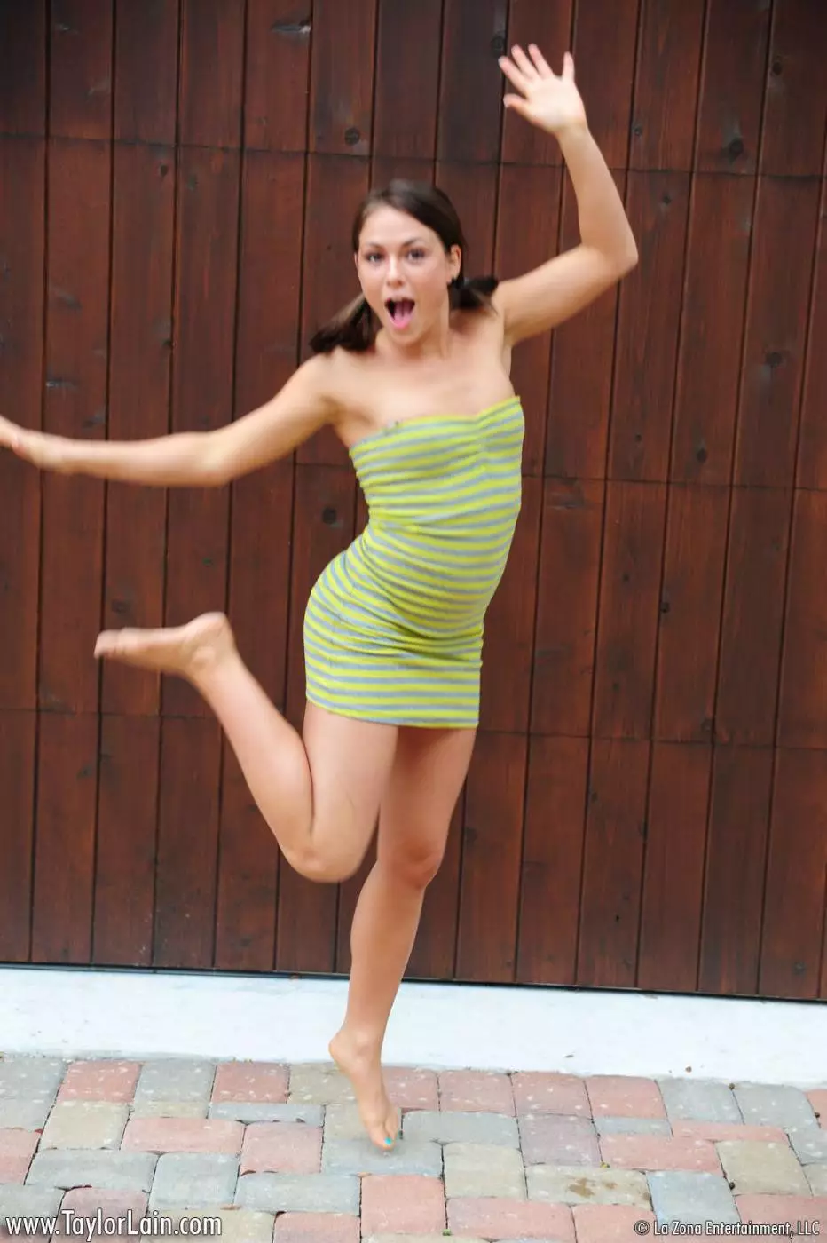 Знойная брюнетка-подросток Taylor Lain красуясь стягивает обтягивающее платье и трусики — Taylor Lain