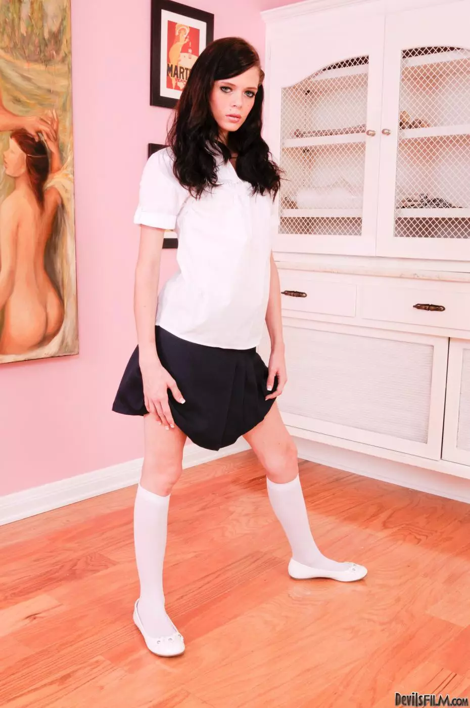 Молоденькая брюнетка Angelina Black показывает свои сиськи в лифчике под блузкой и трусики под юбкой — Angelina Black
