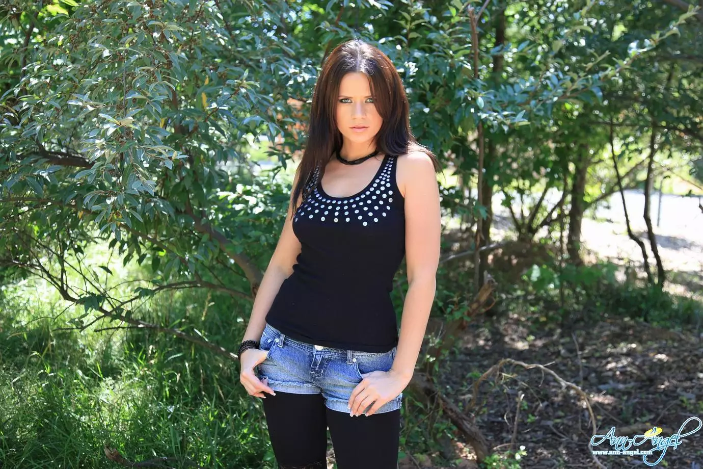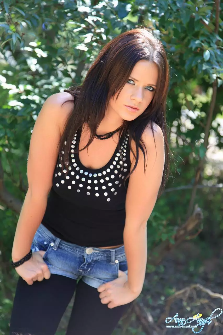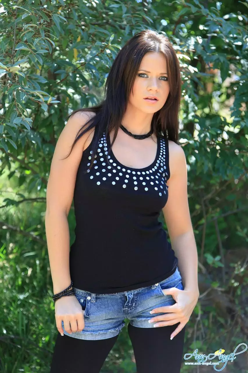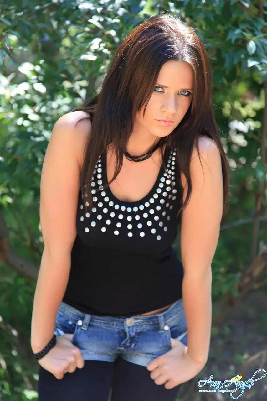 Беспокойная брюнетка Ann Angel в ультра-стильных обрезанных шортах позирует в чем мать родила — Ann Angel