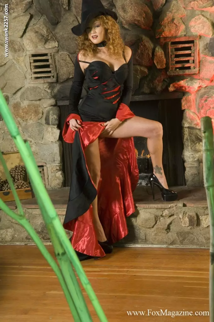 Audrey Hollander в длинном красно-черном платье и в туфлях на платформе, показывает письку — Audrey Hollander