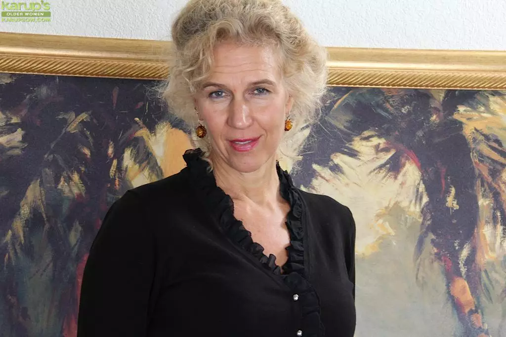 Грязная старая блондинка-мамочка Cally Jo снимает шлюхастую одежду и играет с собой — Cally Jo