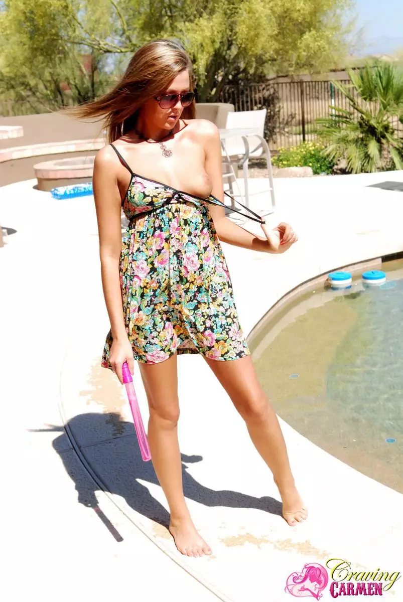 Сексапильная красотка Craving Carmen в солнечном платьице снимает трусики и берется за длинный самотык на улице — Craving Carmen