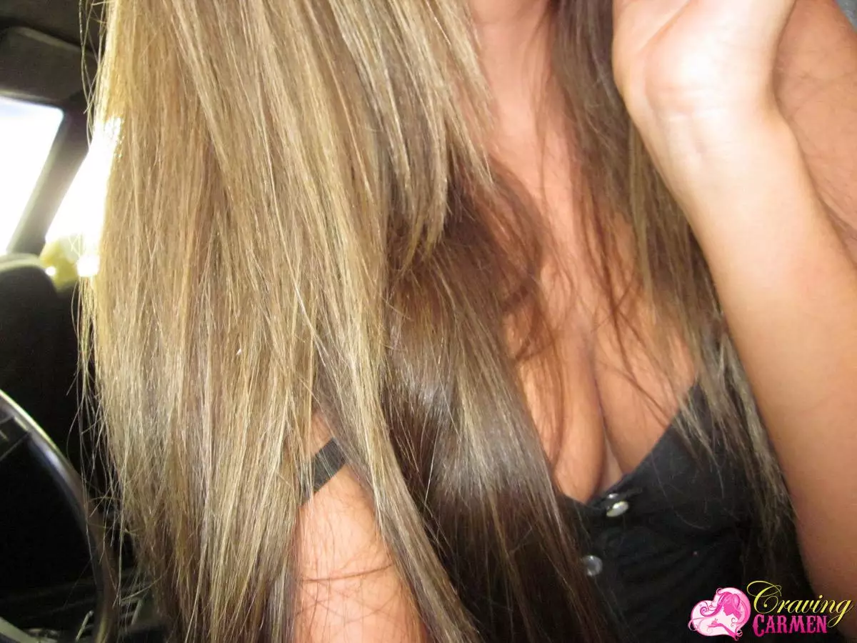 Малышка в джинсовых шортах Craving Carmen показывает свою лысую киску и сиськи в машине — Craving Carmen