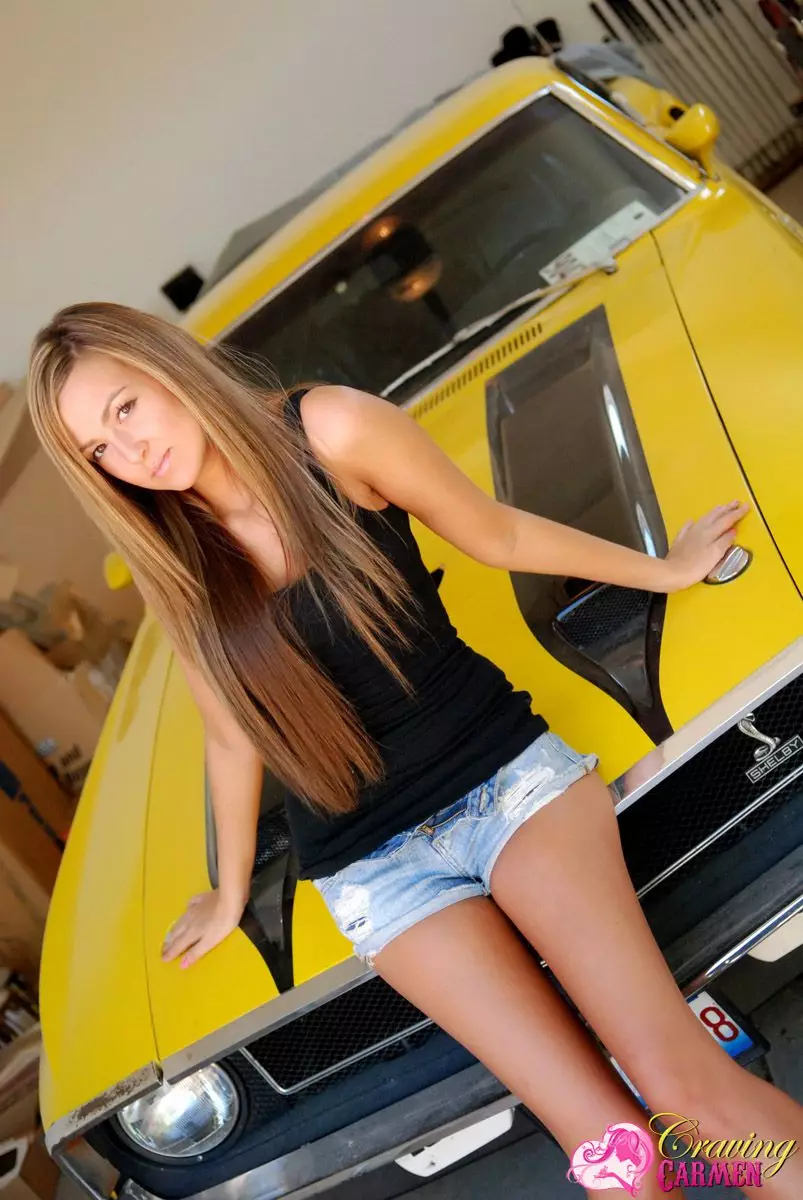 Длинноволосая детка с бритой киской Craving Carmen полностью раздевается в гараже — Craving Carmen