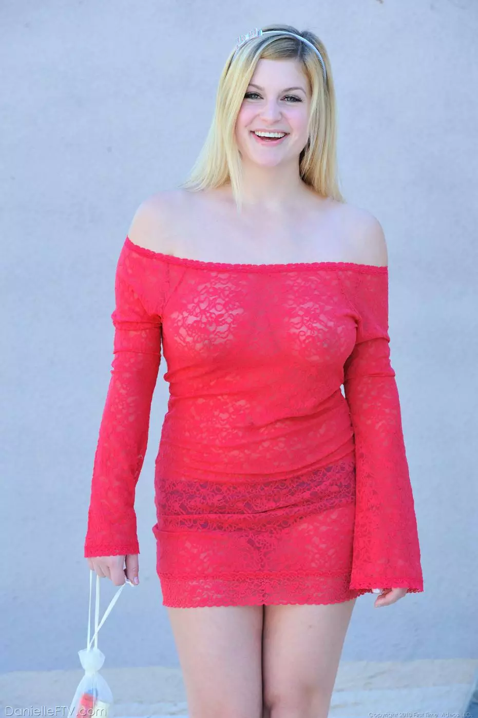 Блондинка с большими натуральными сиськами в красном кружевном платье и белых туфлях - Danielle FTV, долбит игрушкой свою киску — Danielle FTV