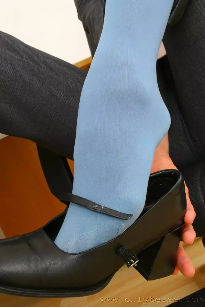 Блондиночка Emma Onlytease в голубых колготках и зеленом нижем белье раздевается в офисе — Emma Onlytease