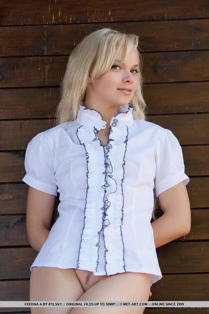 Посмотри на свежую блондинку Feeona A, сидящую под открытым небом с голыми титьками и ножками, выставив киску — Feeona A
