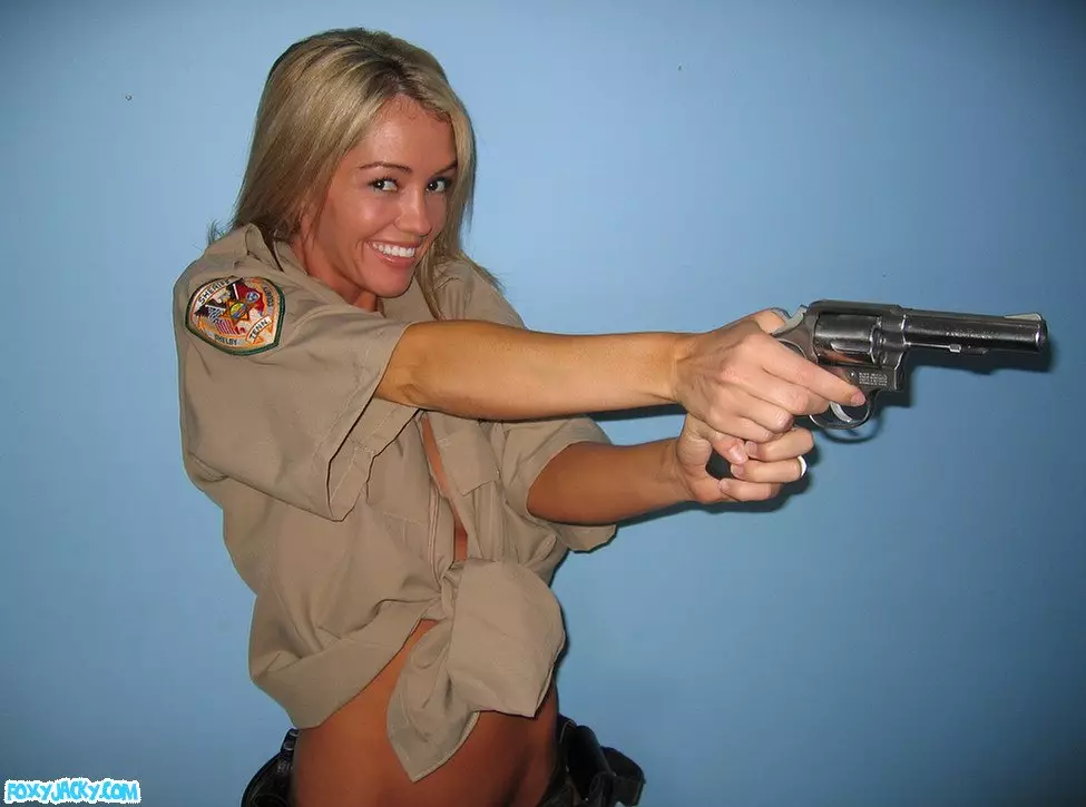 Foxy Jacky показывает свои округлые груди и трахает свою гладкую киску огнестрельным оружием! — Foxy Jacky