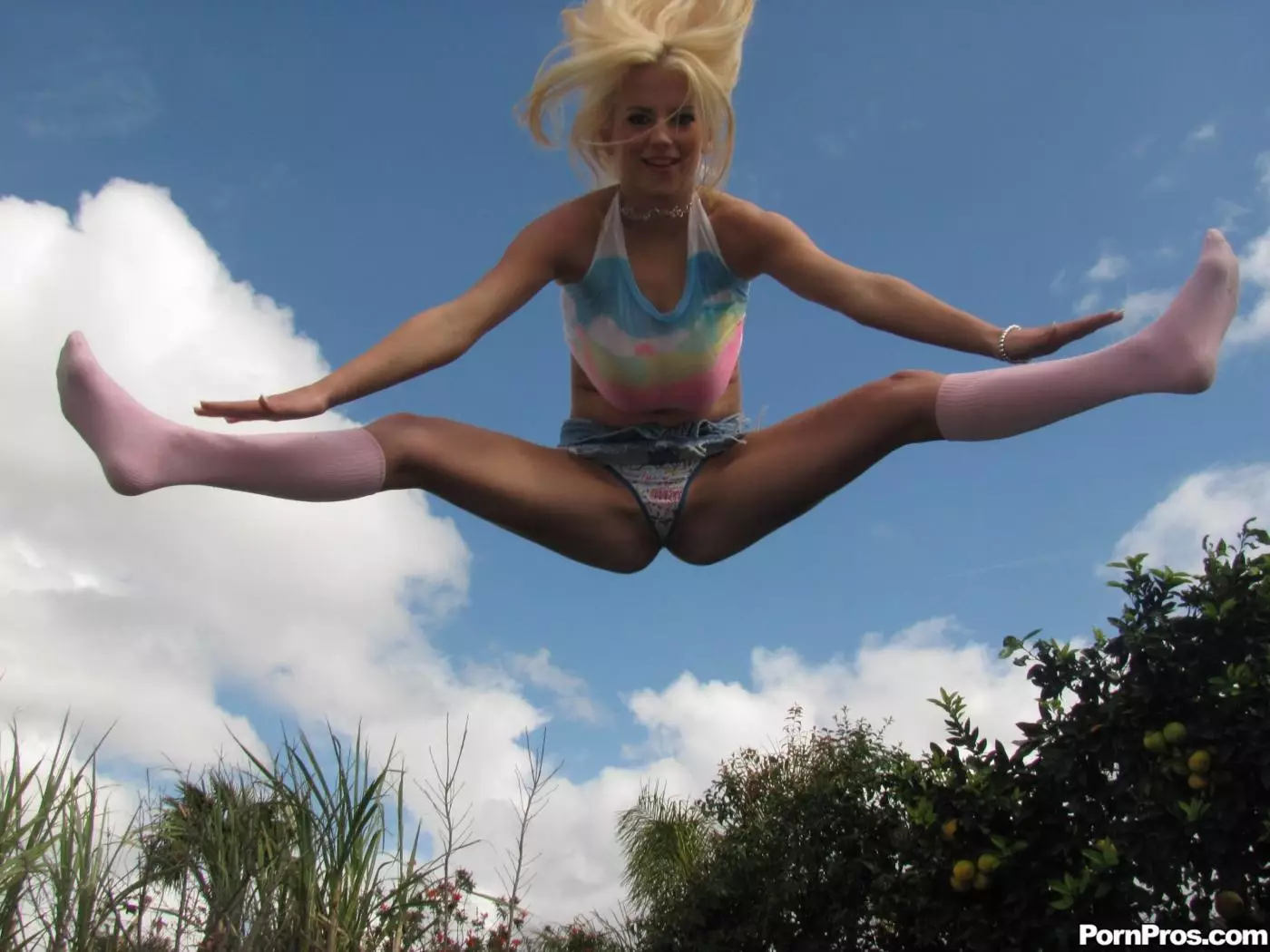 Блондинка с большими дыньками в розовых гольфах Haley Cummings прыгает на батуте, а потом трахается — Haley Cummings