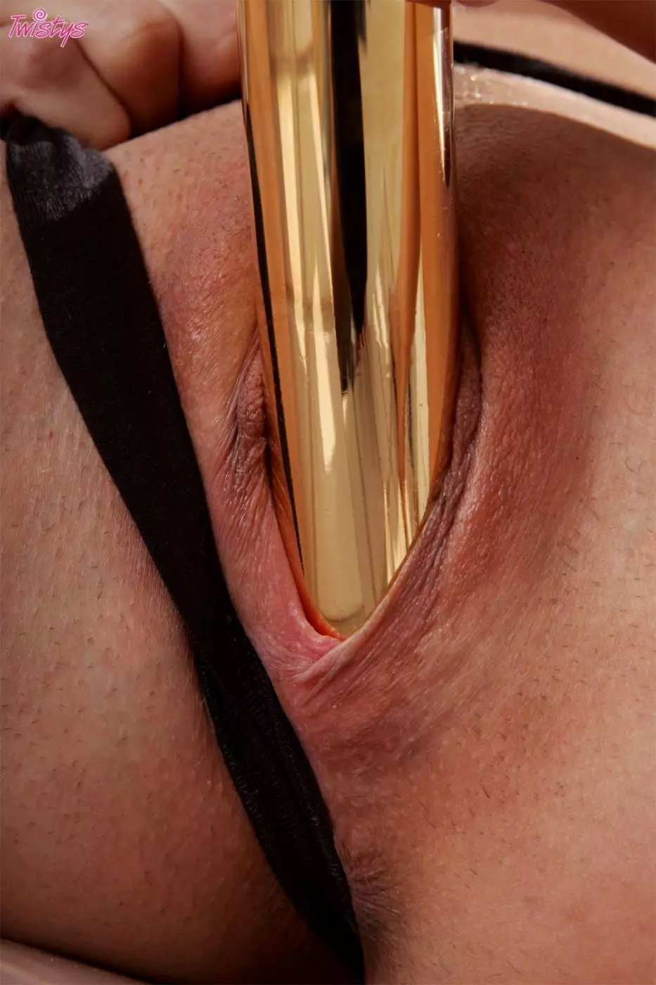 Темноволосая сучка Jamie Huxley оттягивает свои черные трусики и вставляет золотую игрушку в свою розовую дырочку — Jamie Huxley