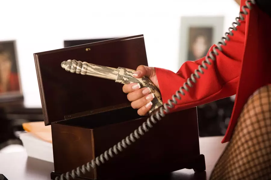 Грудастая и очкастая секретарша Jenaveve Jolie показывает свои прелести и играет с оружием — Jenaveve Jolie