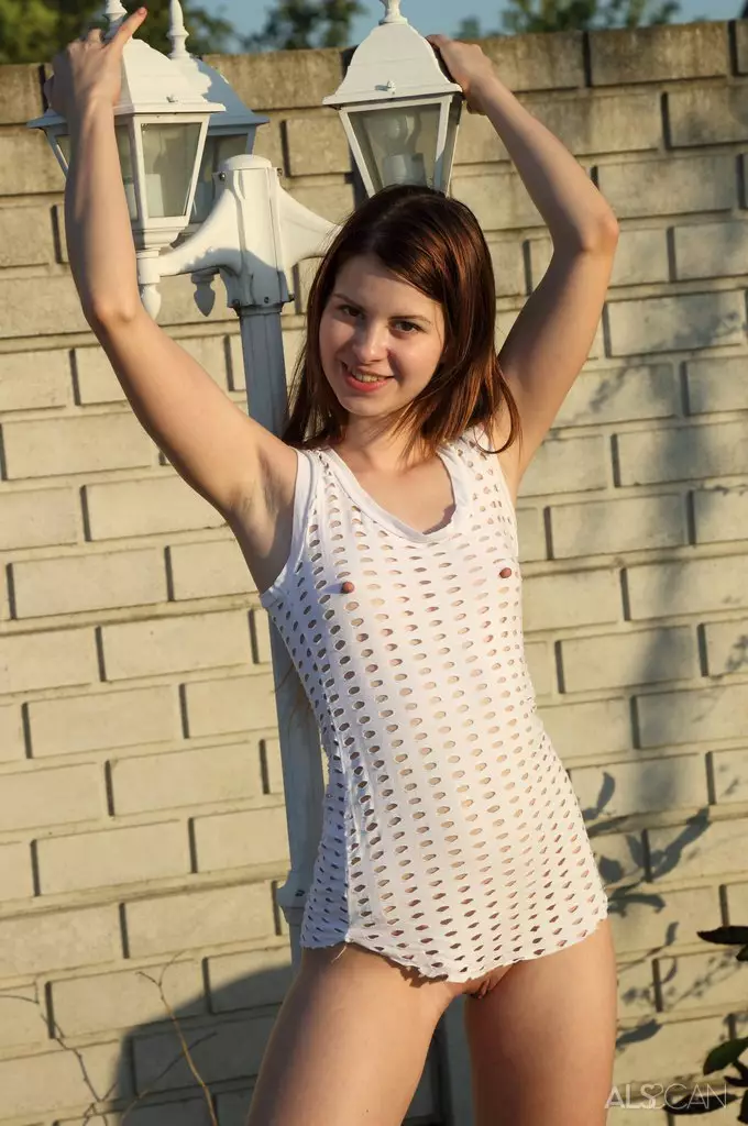 Игривая малышка Judy Smile раздевается на свежем воздухе и трет голую киску напротив кресла — Judy Smile