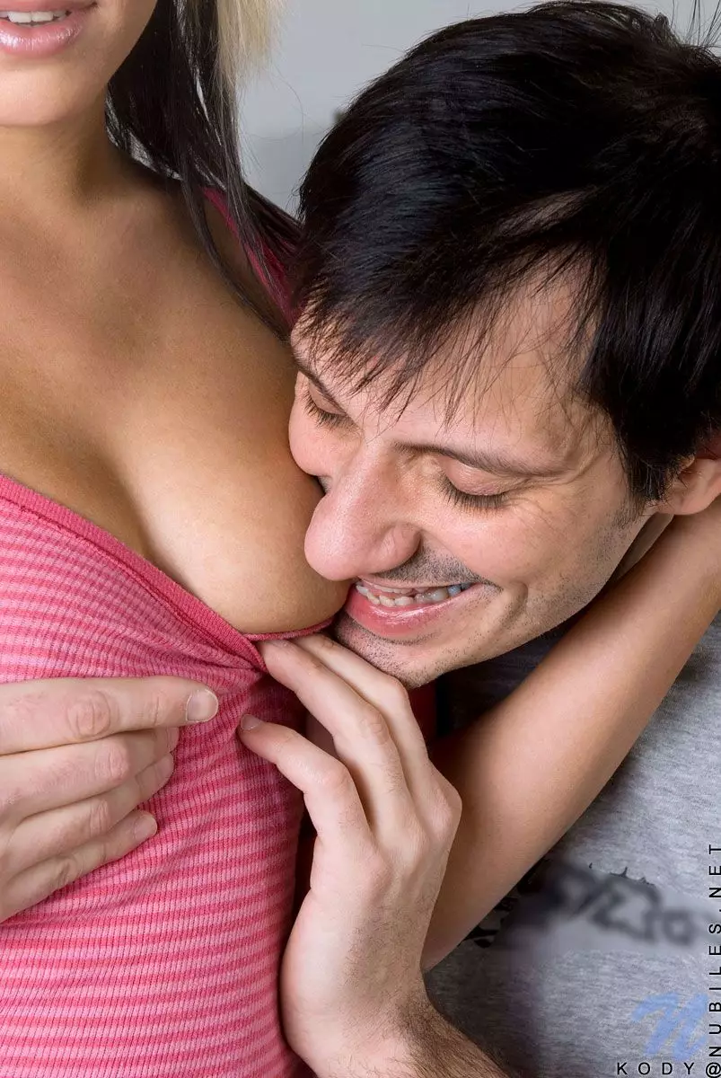 Юной блондинке Kody Kay в синей джинсовой мини-юбке сжимают ягодицы и целую сиськи — Kody Kay