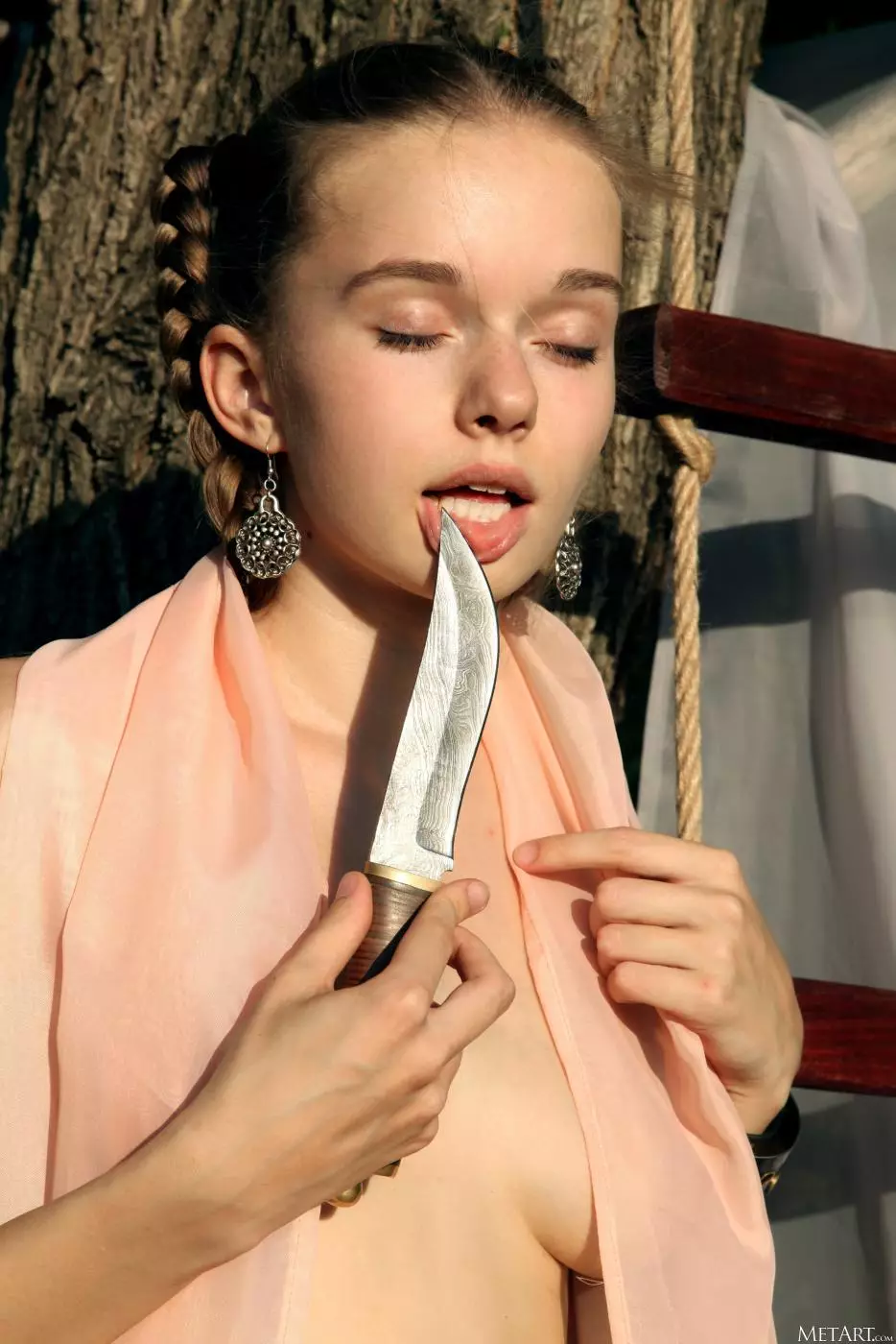 Сексуальная, юная амазонка Milena D обнаженная забирается по лестнице на дерево и раскачивается — Milena D