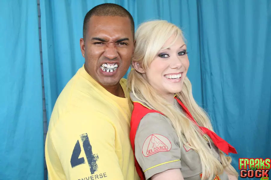 Белокурая девочка - скаут Samantha Sin показала свою бритую пизденку и скользнула на гигантский черный хуй — Samantha Sin