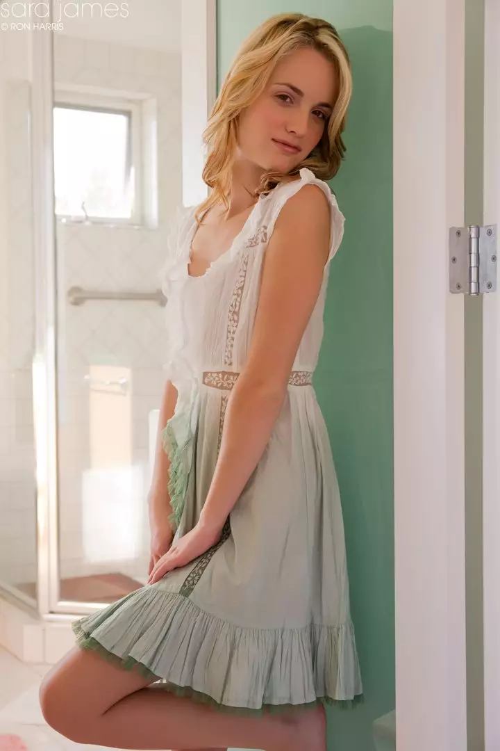 Милая блондинка в невинном белом платье Sara James обнажает свое тело — Sara James