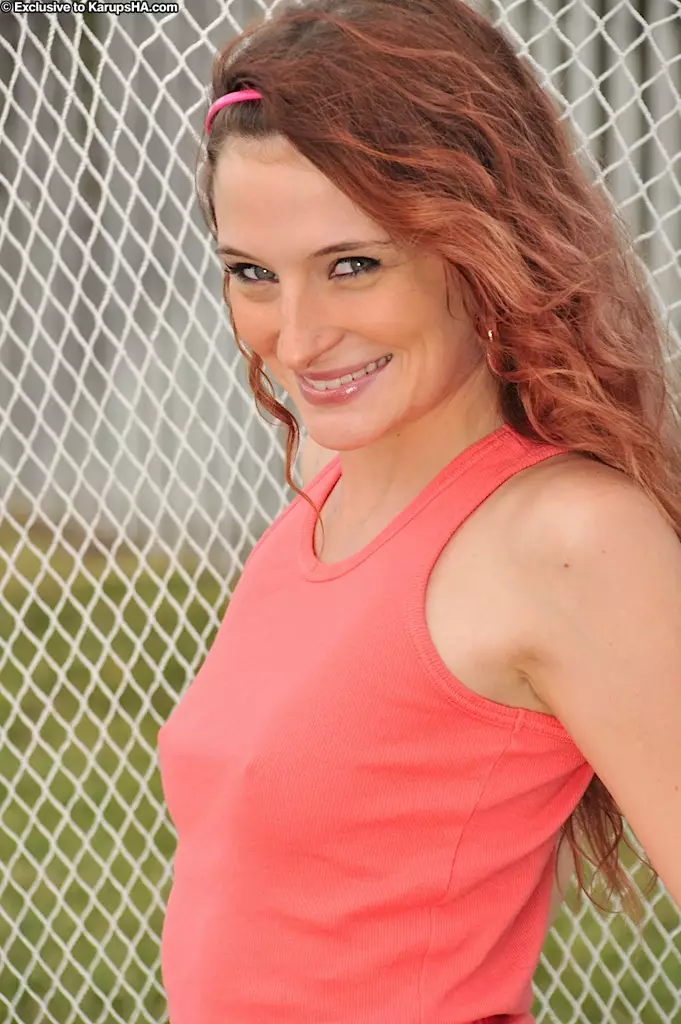 Малышка с маленькими сиськами и рыжими волосами Scarlett West показывает свою гладкую киску на заднем дворе — Scarlett West