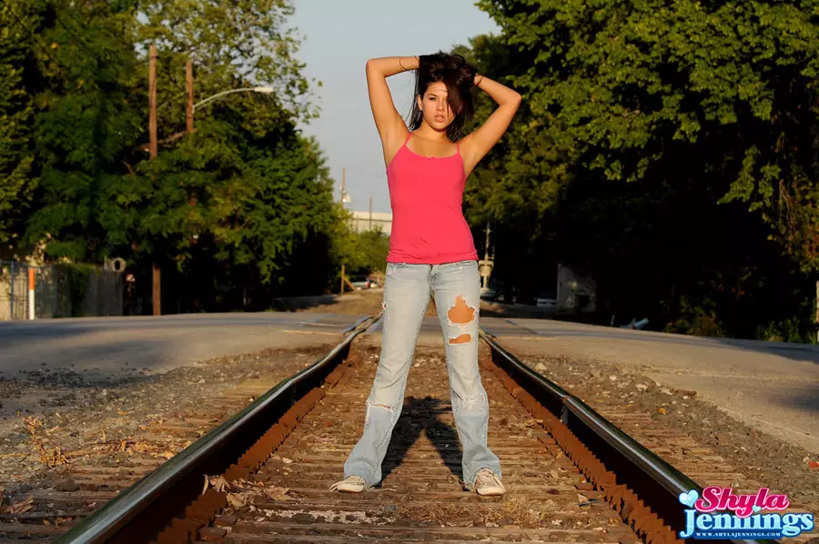 Темноволосая красотка в рваных джинсах Shyla Jennings показывает грудь на дороге — Shyla Jennings