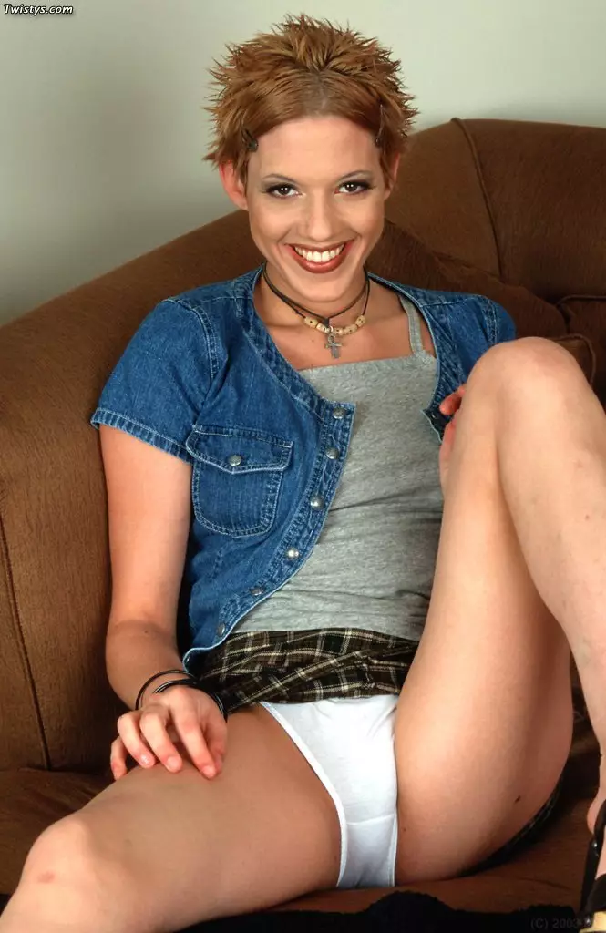 Красотка Syx обнажает свои миниатюрные сиськи с торчащими сосочками и розовую бритую киску — Syx