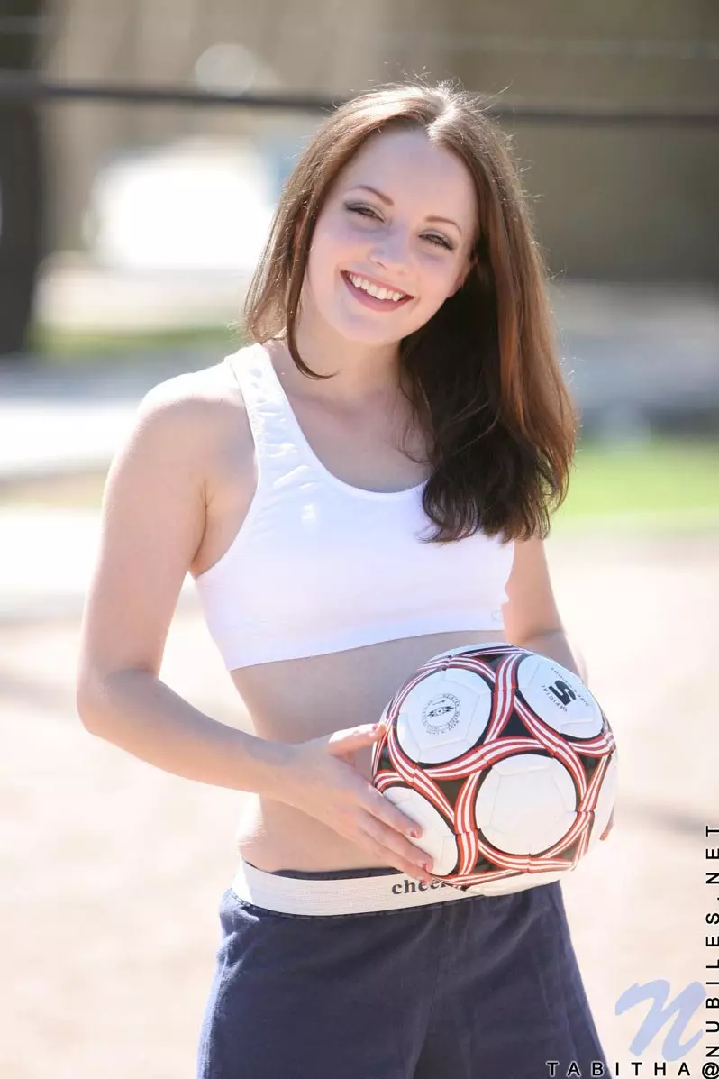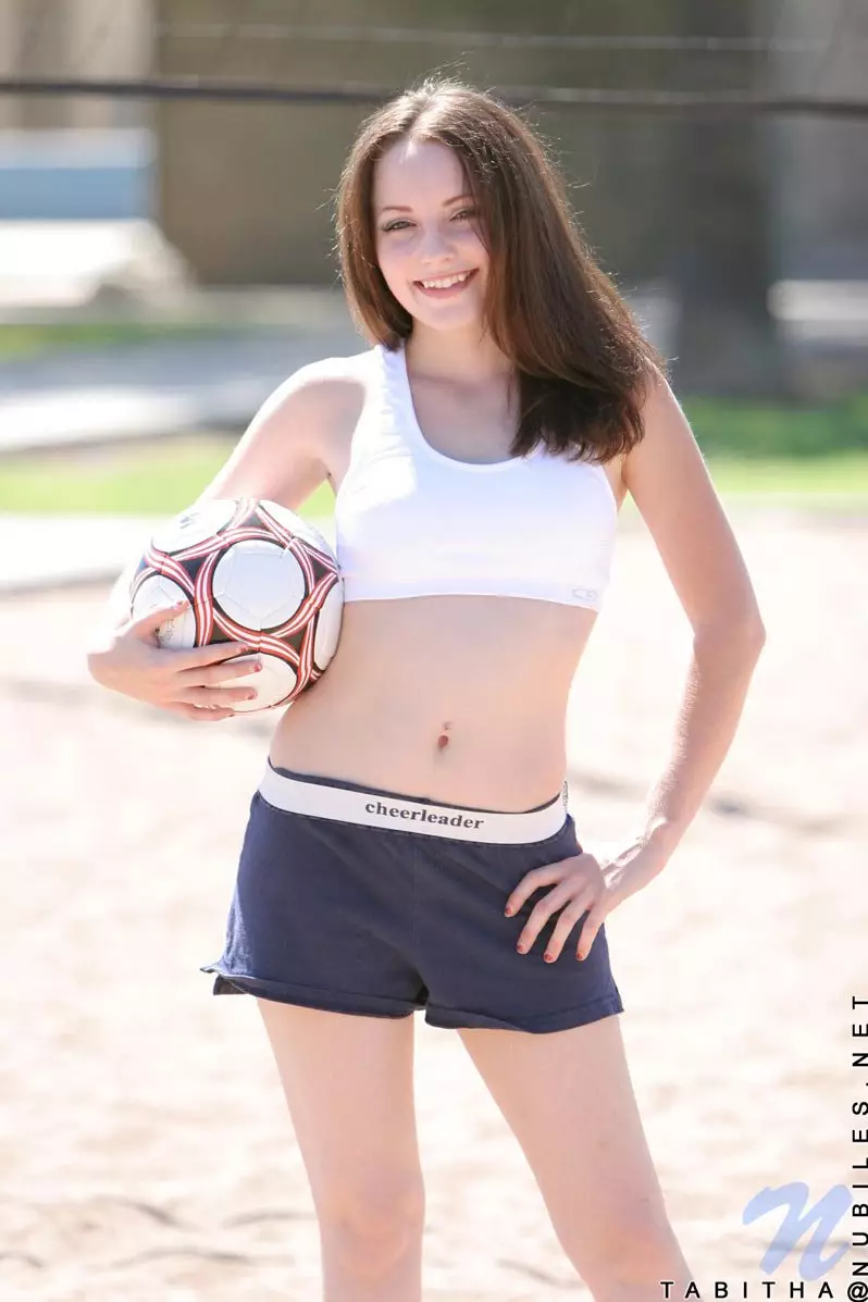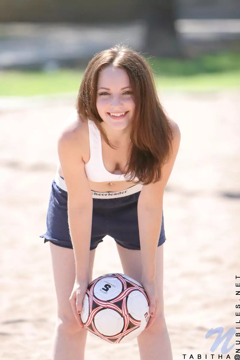 Улыбающаяся спортивная детка в белоснежном топе и синих шортах Tabitha Tucker позирует с мячом на улице — Tabitha Tucker