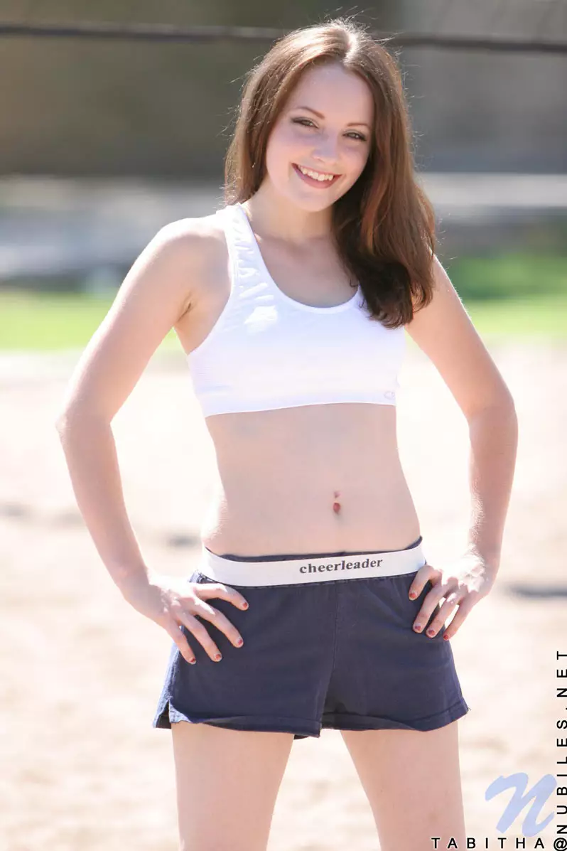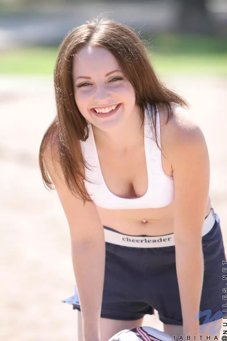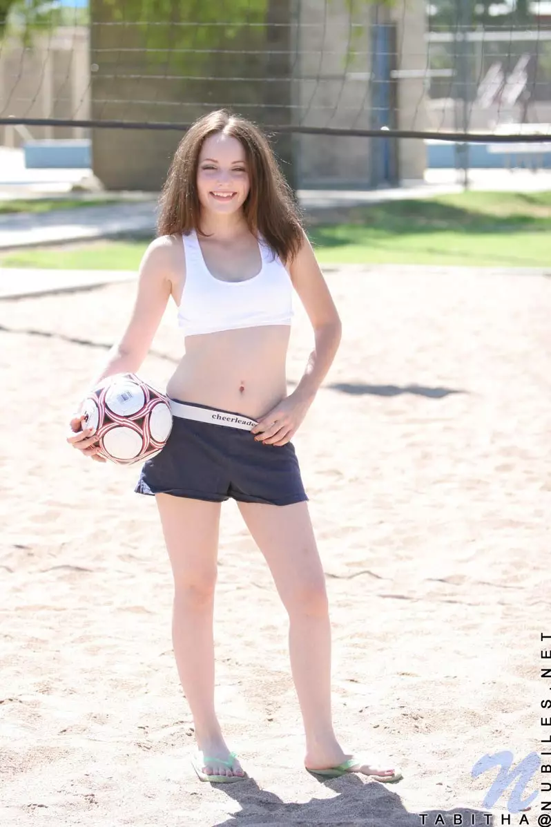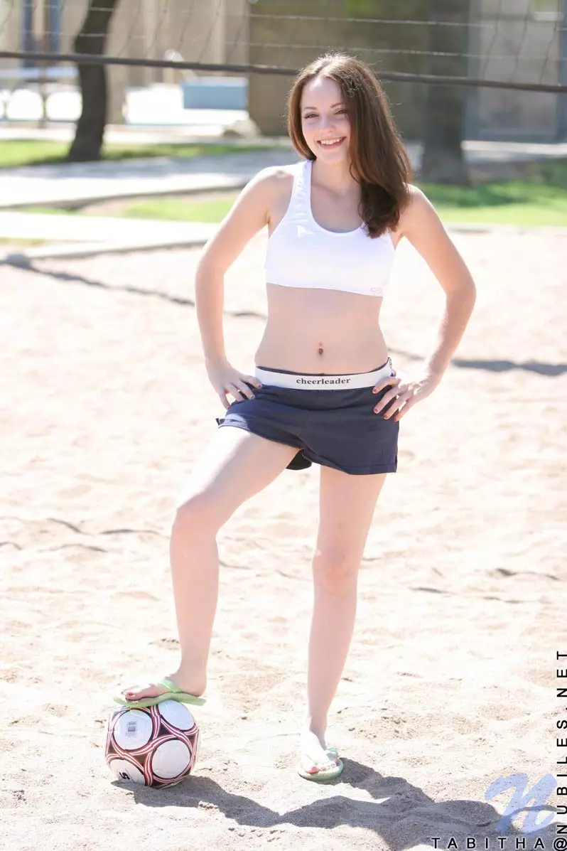 Улыбающаяся спортивная детка в белоснежном топе и синих шортах Tabitha Tucker позирует с мячом на улице — Tabitha Tucker
