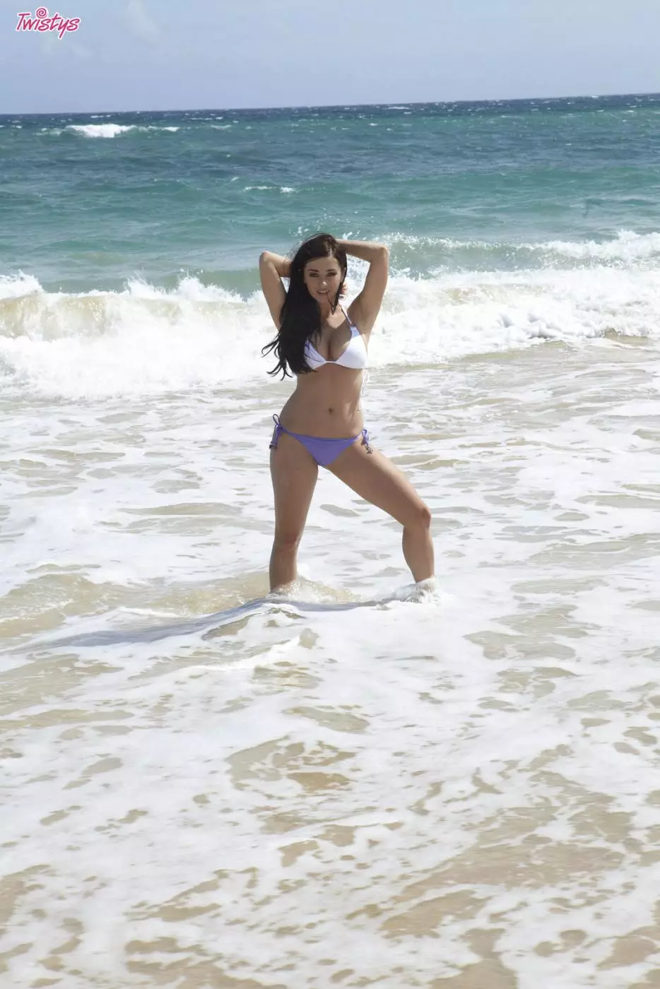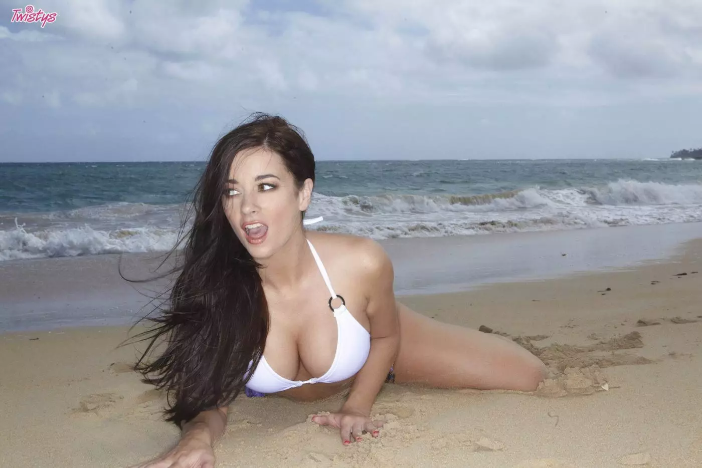 Длинноволосая брюнетка в белом лифчике бикини Taylor Vixen показывает свои большие сиськи на диком пляже — Taylor Vixen