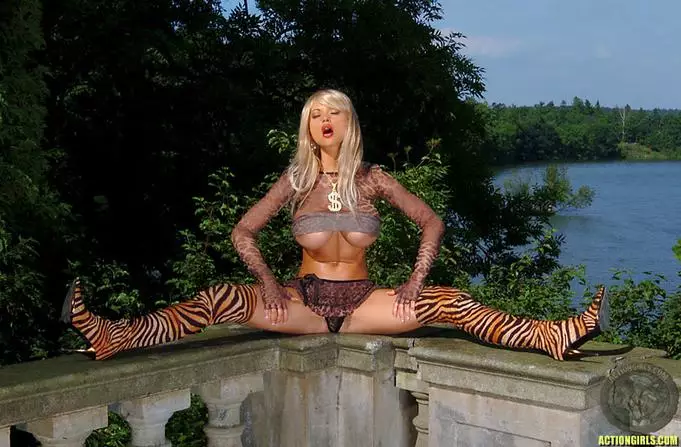 Veronica Zemanova в тигровых сапожках на шпильках и белом парике показывает массивные сиськи на улице — Veronica Zemanova V / Veronica Zemanova |