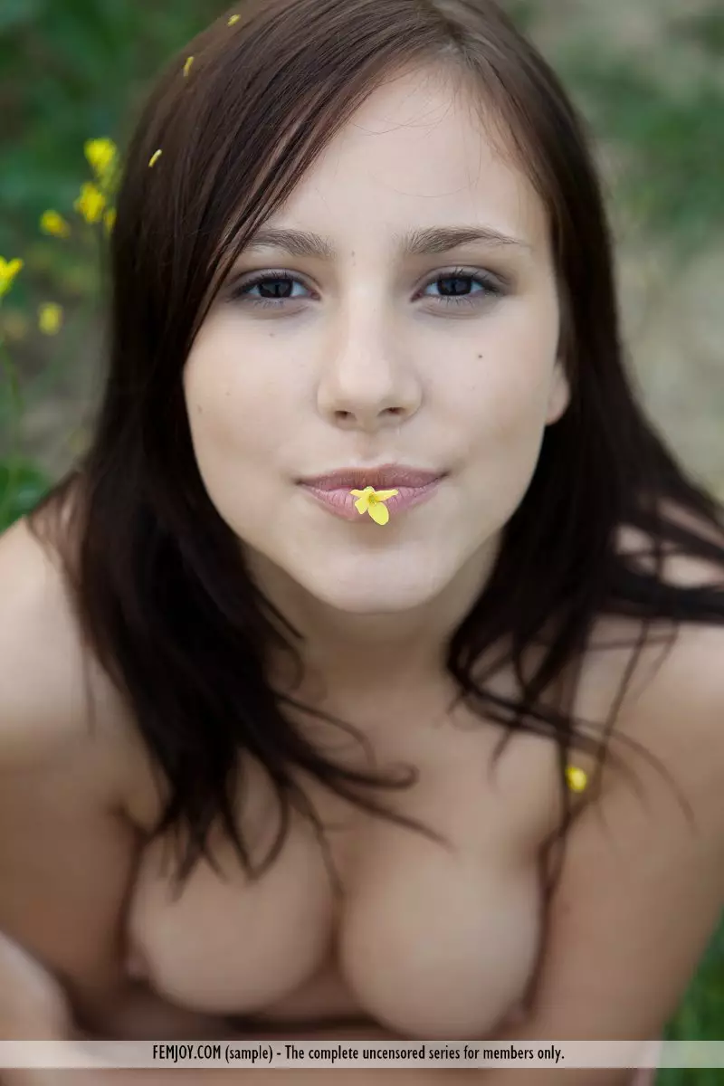 Горячая юная брюнетка Victory Nubiles лежит на цветущем лугу и показывает выбритые щели — Victory Nubiles