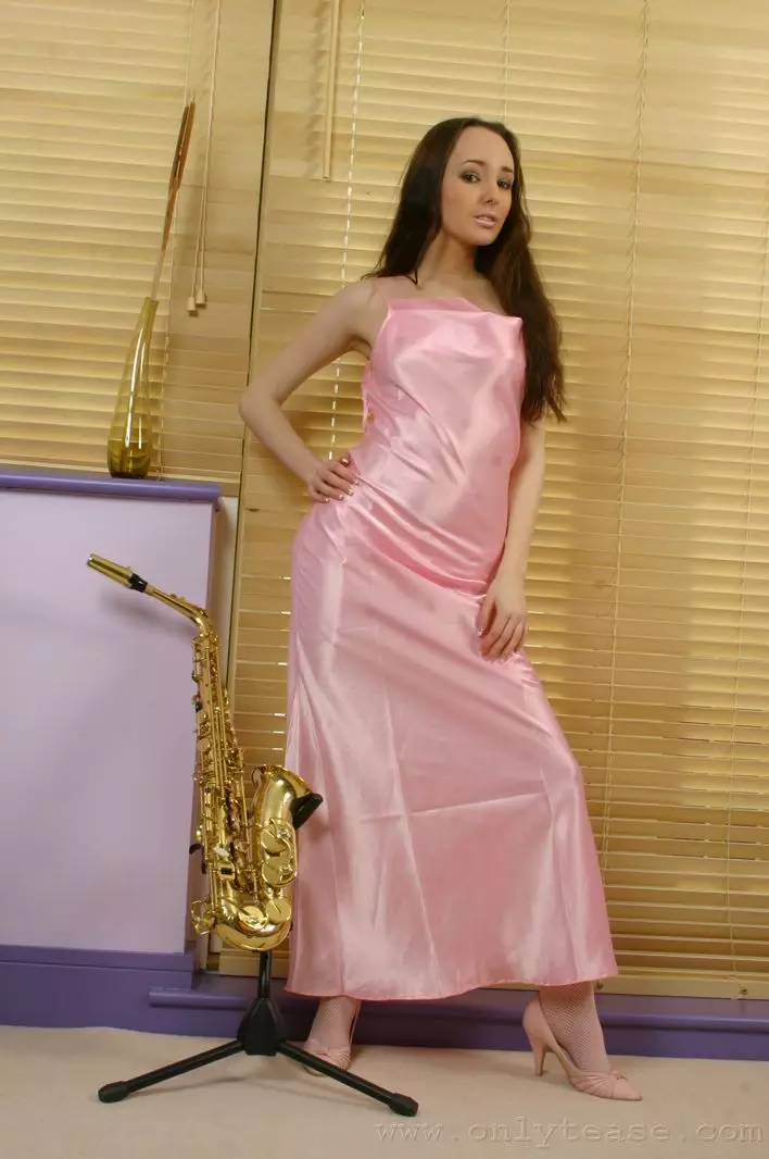Высокая и худая брюнетка в милых чулках Laura J снимает длинное платье из розового шелка — Laura J